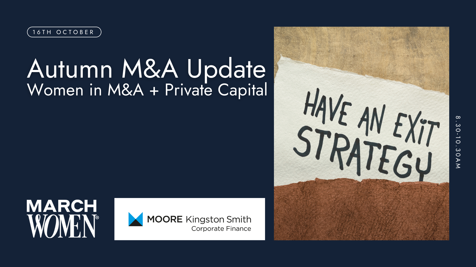 Our Autumn M&A update breakfast, hosted by Moore Kingston Smith. will be discussing exit planning for success.. Moderated by Tabitha Hyde (Associate Director, Corporate Finance) from Moore Kingston Smith, our Autumn M&A Update Panel will feature Mel Reed (MKS, Head of Advisory, M&A Tax partner), Emma Flin (Sovereign Capital, Investment Director) and Helen Mead (DMH Stallard, Corporate Partner).